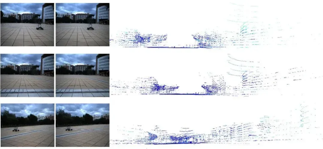 图 2 S3E 数据集的数据示例,每行都显示了不同平台同时捕捉到的双目图像和点云。