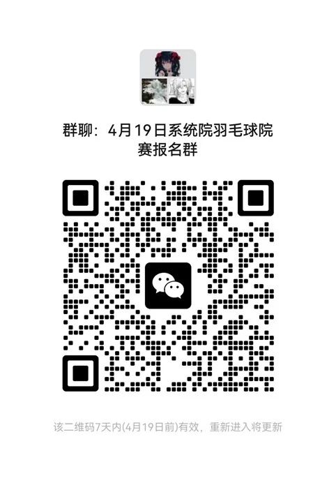 参赛群聊:4月19日系统院羽毛球院赛报名群(二维码见下)