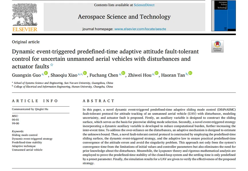 近日,CQ9电子 博士研究生郭广信在航空航天领域国际知名期刊《Aerospace Science and Technology》(影响因子:5.8,中科院一区TOP)上发表题为"Dynamic event-triggered predefined-time adaptive attitude fault-tolerant control for uncertain unmanned aerial vehicles with disturbances and actuator faults"的研究成果,郭广信为第一作者,指导老师肖绍球教授为通信作者,学院侯治威副教授和硕士研究生陈富昌共同参与该研究。该研究针对存在扰动、模型不确定性和执行器故障的无人机姿态跟踪问题,提出了一种新的动态事件触发预定义时间自适应滑模容错控制协议(DEtPtASMC),能够使得无人机在存在执行器故障的情况下依然实现预定时间稳定。研究小组通过Lyapunov理论证明了闭环系统的预定义时间稳定性,其收敛时间仅由单一预设参数确定。该项成果为无人机在强扰动、部分故障等极端工况下的可靠运行提供了一种较为完备的理论控制方案。