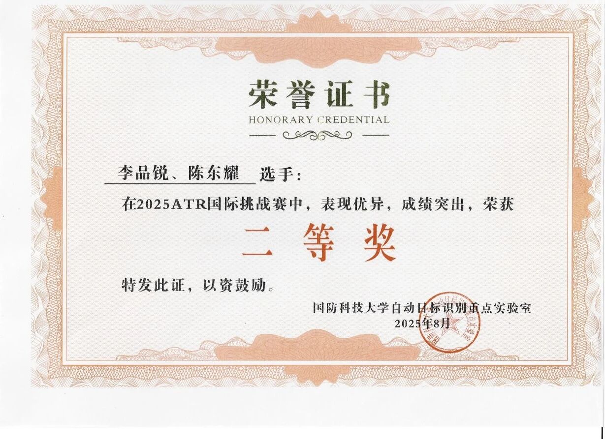 2025年8月31日,第四届ATR国际挑战赛决赛在长沙圆满落幕,CQ9电子 博士生李品锐,硕士生陈东耀组成的“追梦队”在参赛的66支代表队中脱颖而出,获得大赛二等奖,展现了中大学子的科创实力与竞技风采。