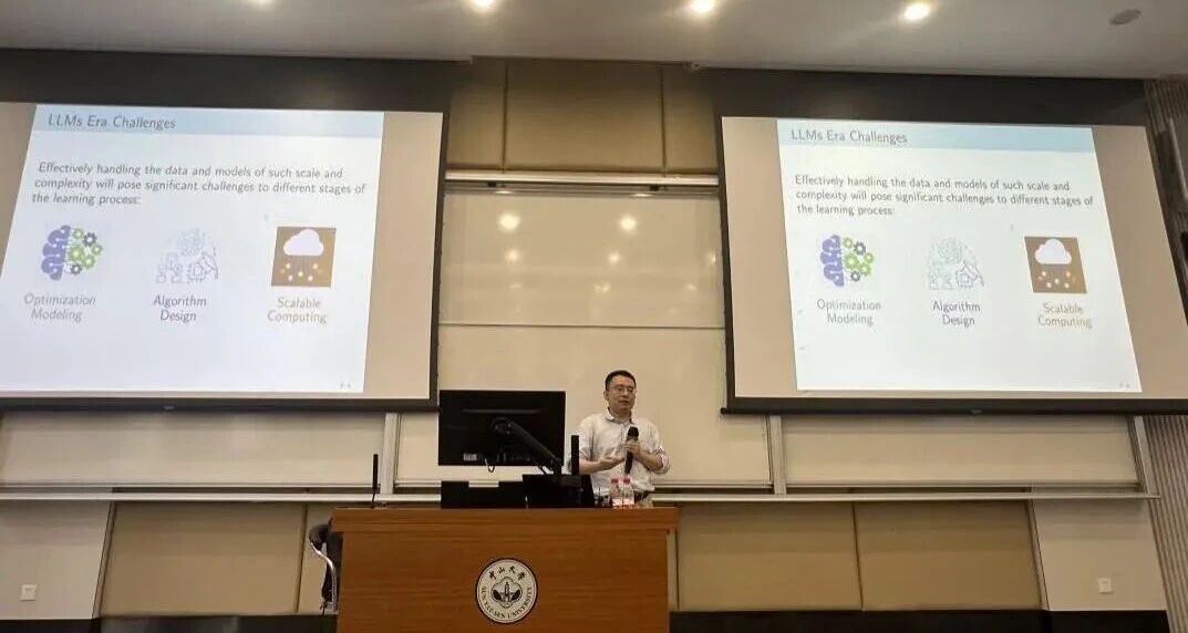随后,吕教授结合自身研究成果,详细讲解了双层优化在元学习(Meta-Learning)、超参数优化(Hyperparameter Optimization)、强化学习(Reinforcement Learning)及预训练—微调(Pretraining–Finetuning)等典型场景中的应用。他重点介绍了隐式求导、罚函数法、最小–最大优化以及动态平滑等求解思路,展示了该领域在解决多层耦合学习任务中的最新进展。
