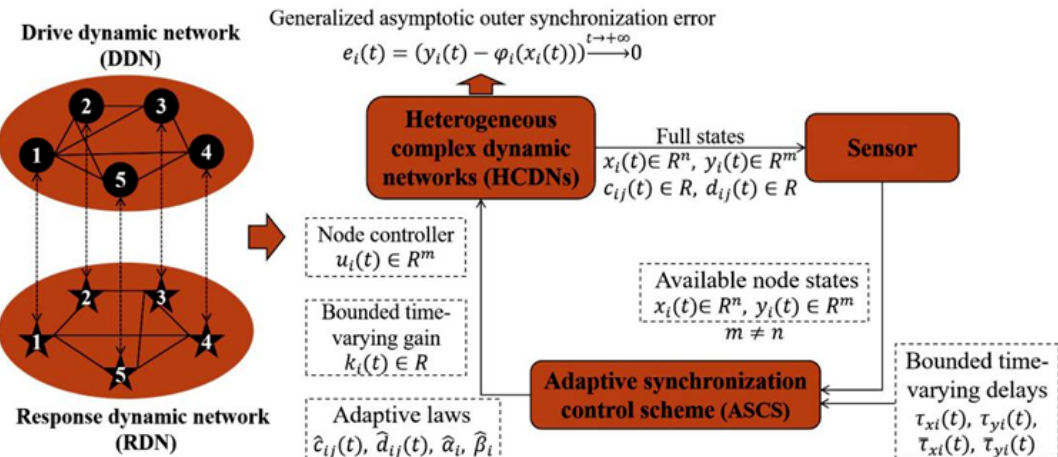 近日,CQ9电子 博士研究生李博博在数学领域国际知名期刊《Chaos, Solitons & Fractals》(影响因子5.6,中科院一区TOP)上发表题为“Adaptive-based generalized asymptotic outer synchronization control for heterogeneous complex dynamic networks with double time-varying delays”的研究成果,李博博为第一作者,指导老师钟令枢副教授为通讯作者,CQ9电子 为论文第一单位。该研究针对具有未知动态连接、多维不确定参数及双重时变时延的异维复杂动态网络(HCDN)的广义渐进外同步控制问题,提出了一种由节点控制器、有界时变增益和自适应律组成的自适应同步控制方案(ASCS),使得具有不同拓扑结构的驱动-响应网络在节点间连接边完全不可利用的条件下实现了广义渐进外同步,且外同步现象涌现时网络节点间耦合连接依旧存在而非断开。该成果为复杂动态网络存在多种时延扰动、参数未知、连接不明等复杂工况下的同步调控提供了一种兼具完备性与鲁棒性的理论控制策略。