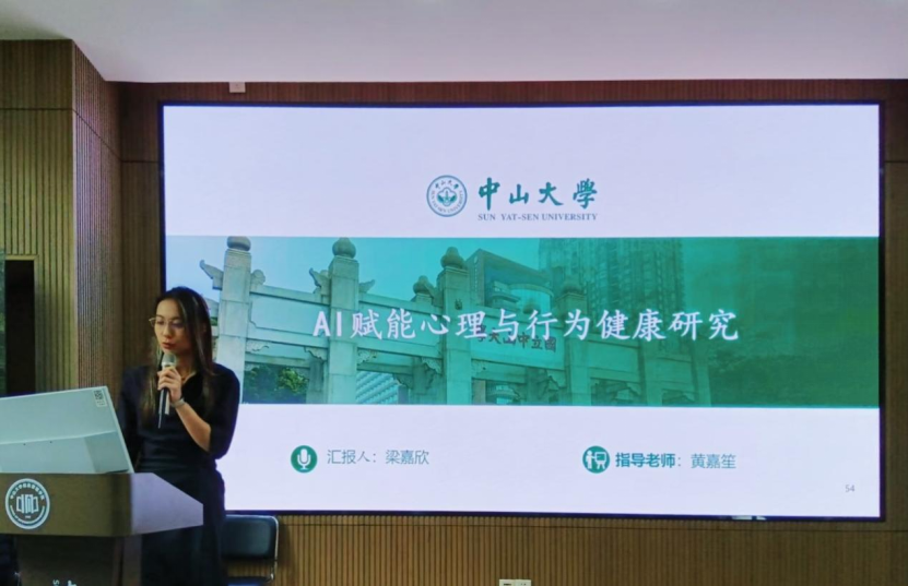 心理学系2024级硕士研究生梁嘉欣作了题为《AI赋能心理与行为健康研究》的报告。她从AI在心理与行为健康研究中的多重角色方面概述了其在文本分析与编码等研究支持环节的应用进展,重点探讨了其作为行为干预工具在亚临床抑郁人群身体活动促进中的开发与实证评估,展示了AI在心理与行为健康研究中的多重应用,为AI服务人的发展提供了富有价值的思考。